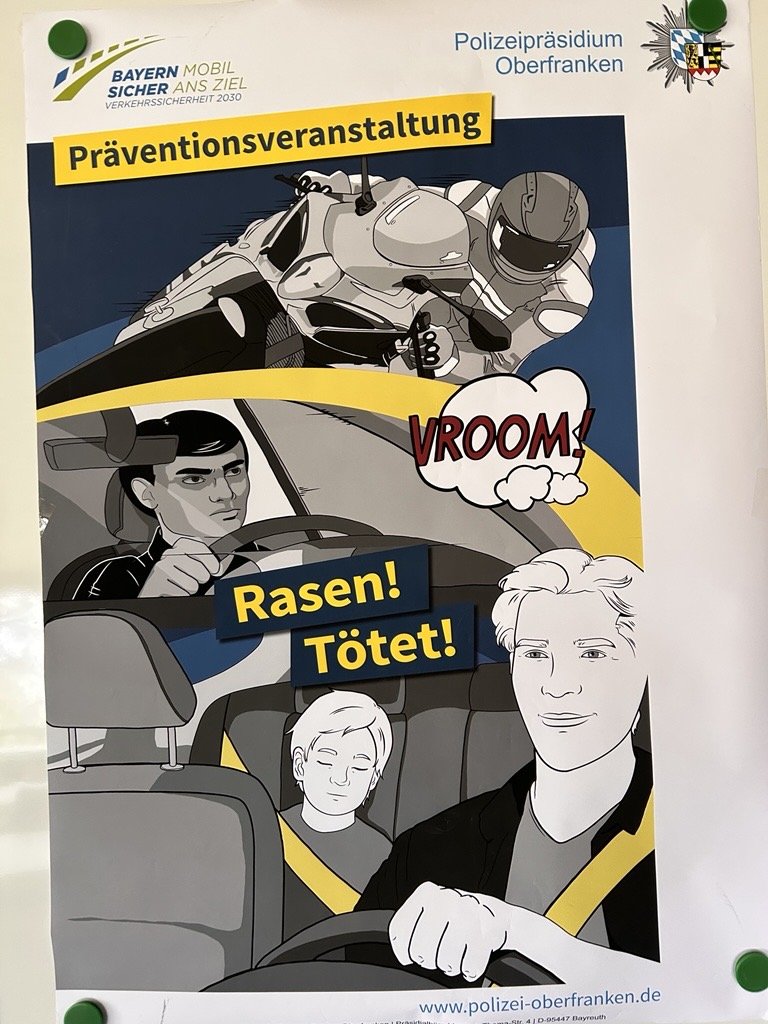 In der Woche vom 20. bis 24. April fand an unserer Berufsschule das eindrucksvolle Präventionsprojekt „Rasen tötet“ des Polizeipräsidiums Oberfranken statt. Ziel der Veranstaltung war es, junge Erwachsene für die Gefahren von überhöhter Geschwindigkeit und illegalen Straßenrennen zu sensibilisieren.