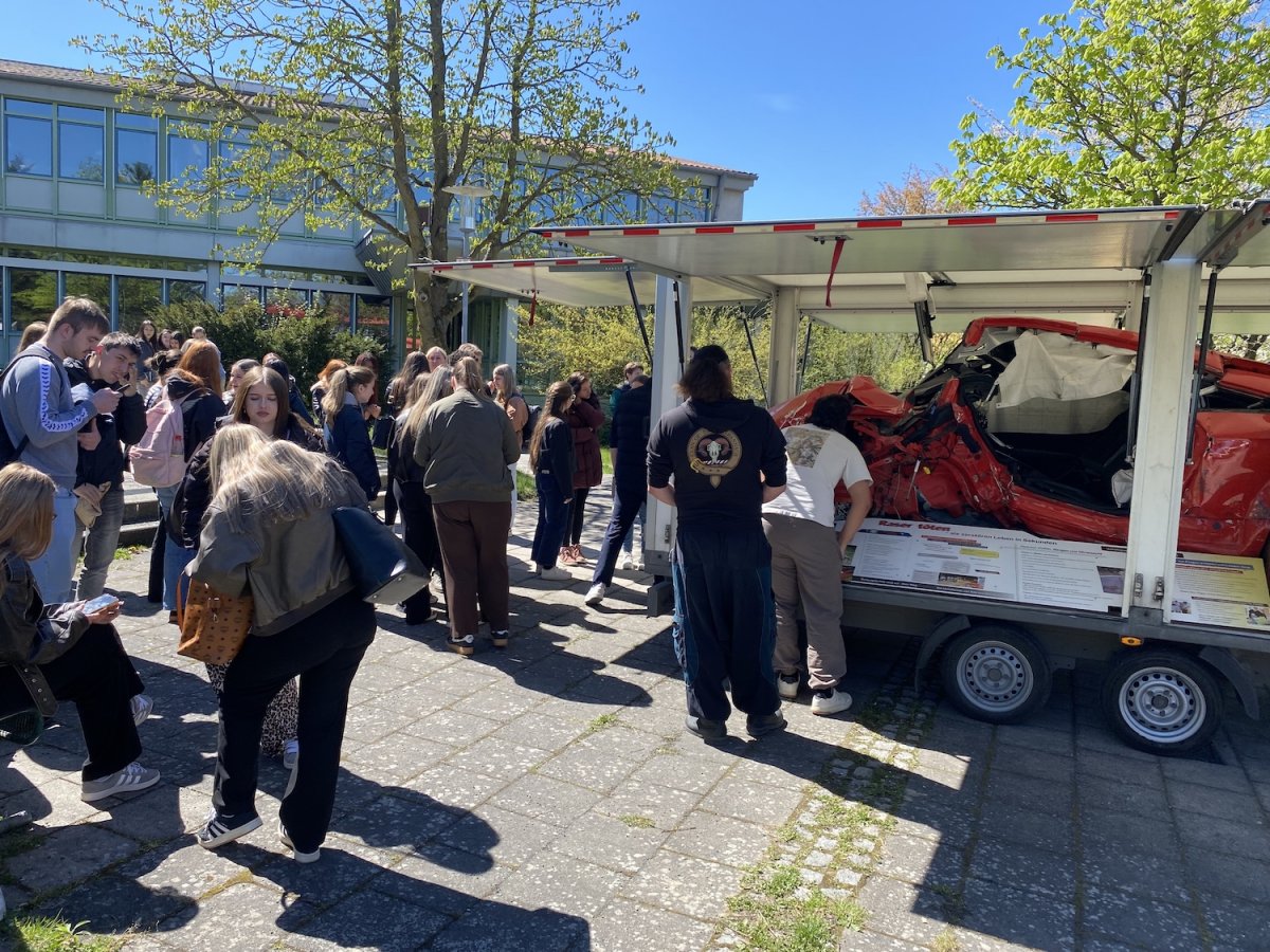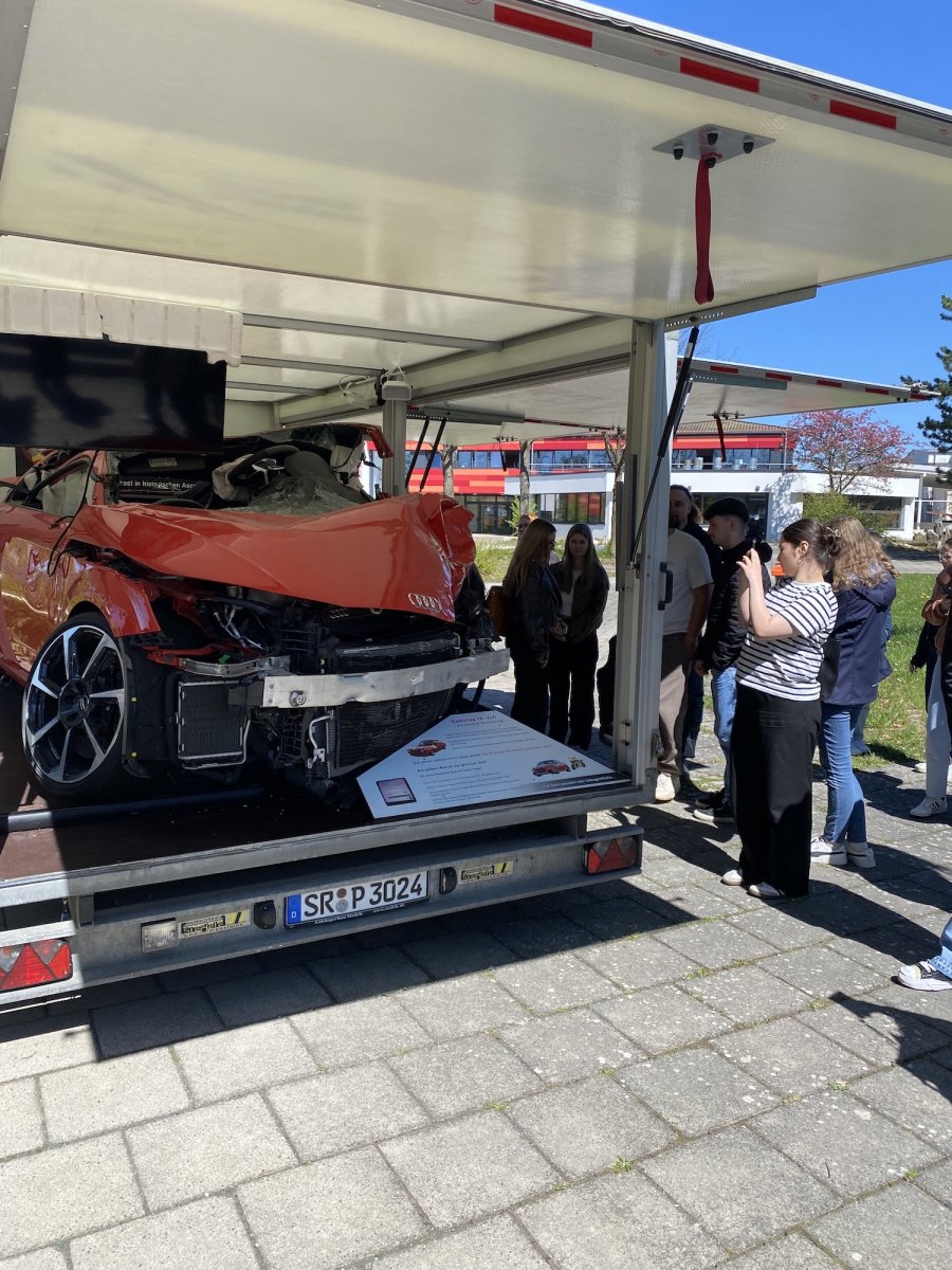 Am Ende der Veranstaltung hatten die Schülerinnen und Schüler zudem die Möglichkeit, sich auf dem Schulhof einen Anhänger mit den originalen Unfallfahrzeugen anzusehen. Diese direkte Konfrontation mit den realen Folgen eines solchen Geschehens hinterließ bei vielen einen besonders nachhaltigen Eindruck.